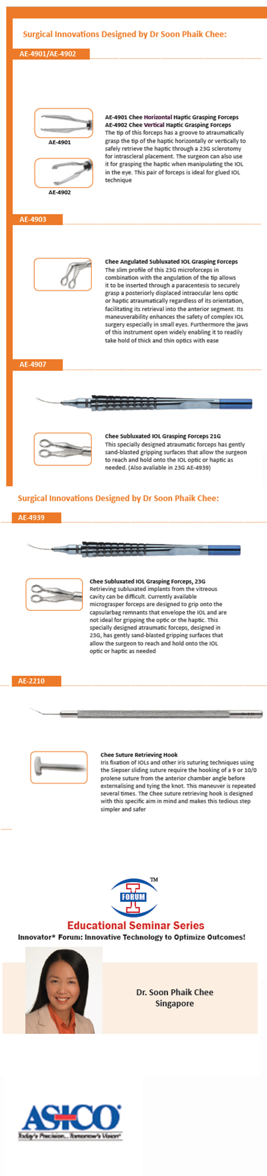 Professors Chee and Yeoh have designed numerous surgical instruments to facilitate smoother, safer and more successful surgery in our cataract patients. Many of these instruments are manufactured and sold to eye surgeons by ASICO, a leading American instrument manufacturer. (Neither Prof Chee nor Yeoh derive royalties or payments for these designs as we believe everyone should benefit from them)